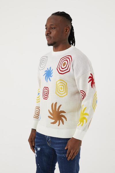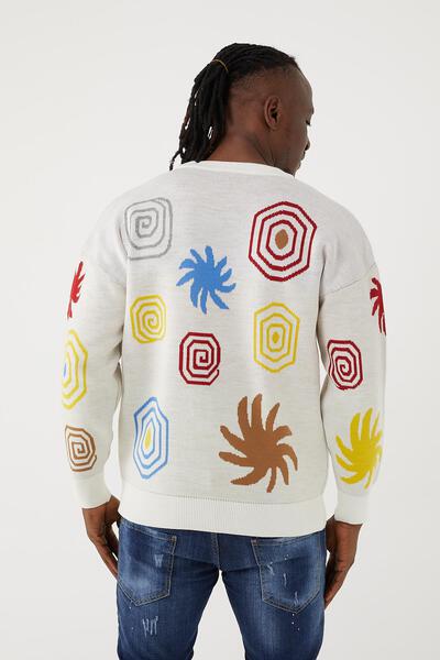 Turn heads this season with our Men’s Abstract Graphic Knit Crewneck Sweater, featuring a bold fusion of retro and modern art-inspired motifs. Designed on a clean white knit base, this pullover showcases a vibrant arrangement of colorful spiral and swirl patterns in red, blue, yellow, brown, gray, and tan — giving off a playful, artistic streetwear vibe.