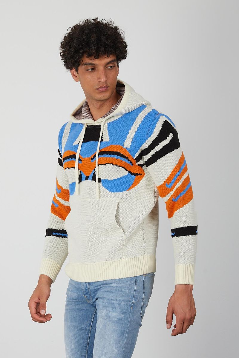 Push the boundaries of fashion with this bold Men’s Graphic Face Knit Hoodie—a unique pullover made for those who lead the culture, not follow it. Featuring an art-forward face graphic in vivid blue, bright orange, and bold black, this cream knit hoodie blends comfort with creative energy. The abstract design draws influence from street art and modern pop graphics, making it the perfect statement knitwear for the fashion-forward guy.