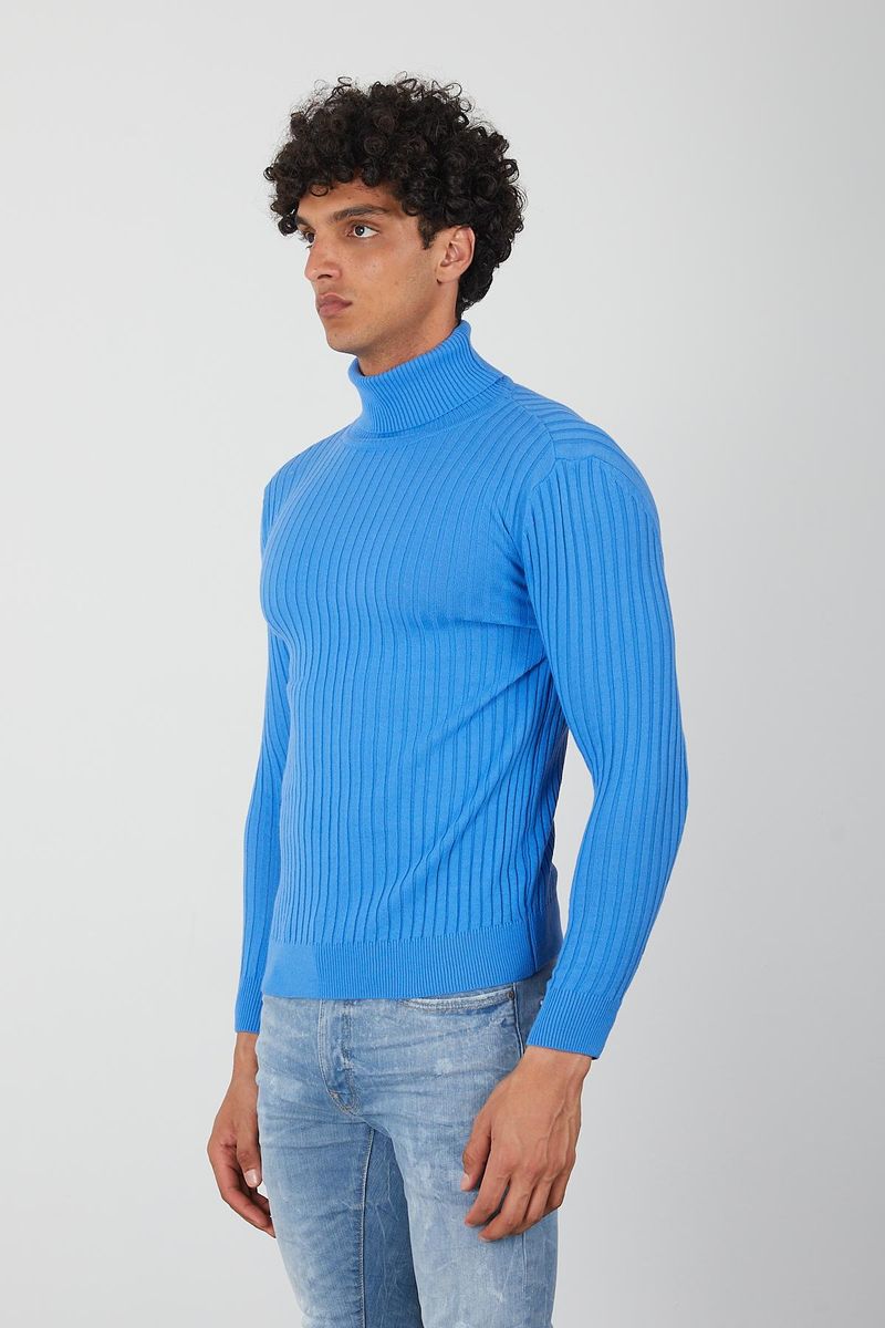 Shop the blue ribbed men’s turtleneck sweater — slim fit, soft knit, and classic high neck style. A clean, modern essential for layering and winter wear.